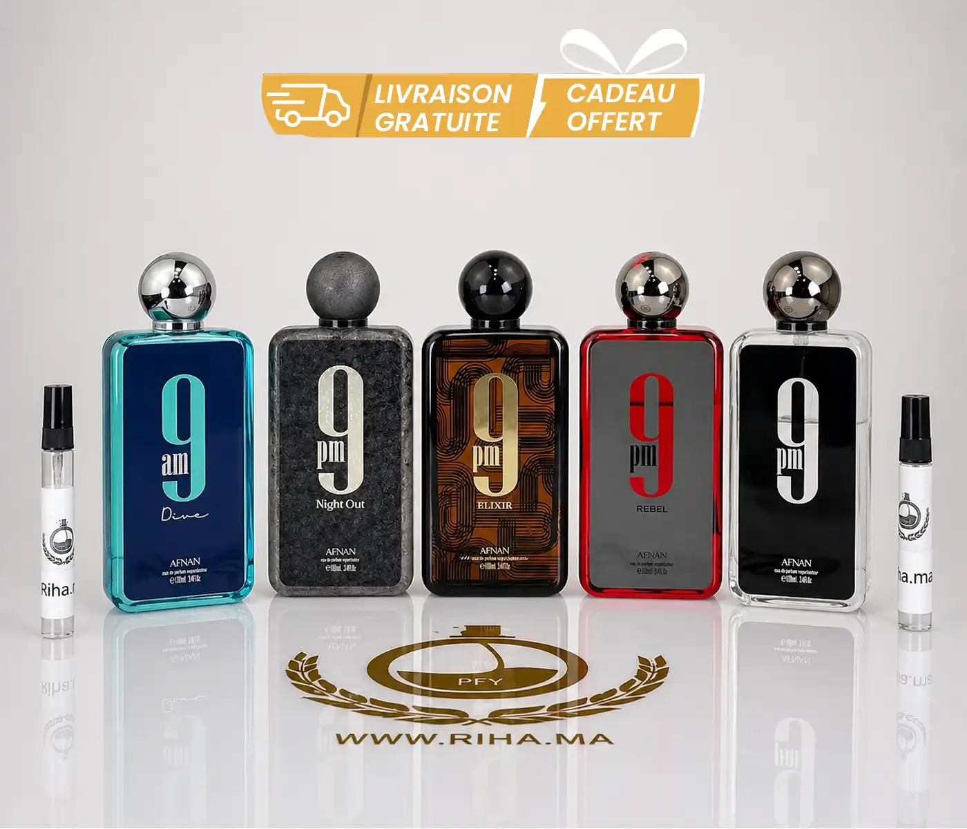 Disponible chez RIHA.ma, ce pack décantage Afnan 9PM Maroc vous permet de tester plusieurs parfums en 5ml ou 10ml sans acheter un flacon complet.